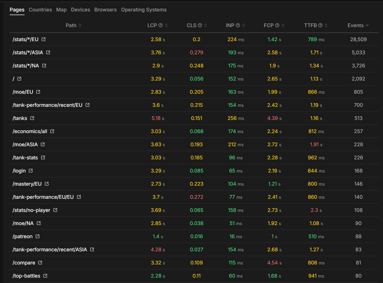 Eesee Metrics's performance tab shows you the Largest Contentful Paint (LCP) for each page. If your product pages or checkout pages have poor performance metrics, you should optimize them. The performance dashboard makes it easy to identify which pages need optimization.